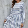 This dress has a Flattering High Round Neckline and Elbow Length Sleeves.