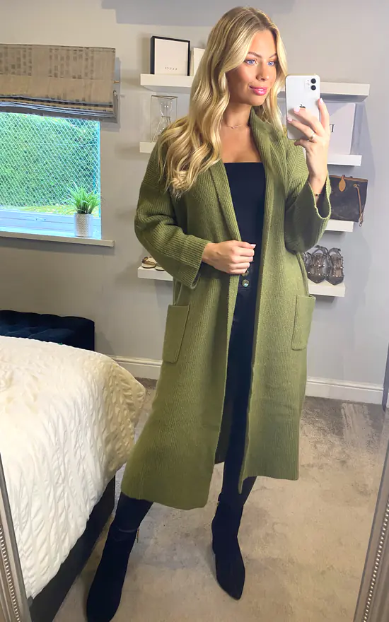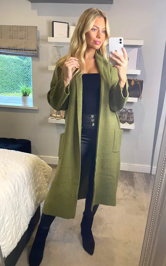 An A/W wardrobe staple, this super soft knitted maxi cardigan is all about the long line fit, roomy pockets and stunning green shade. Perfect paired with jeans or a bodycon dress.