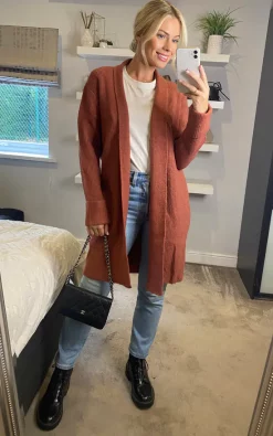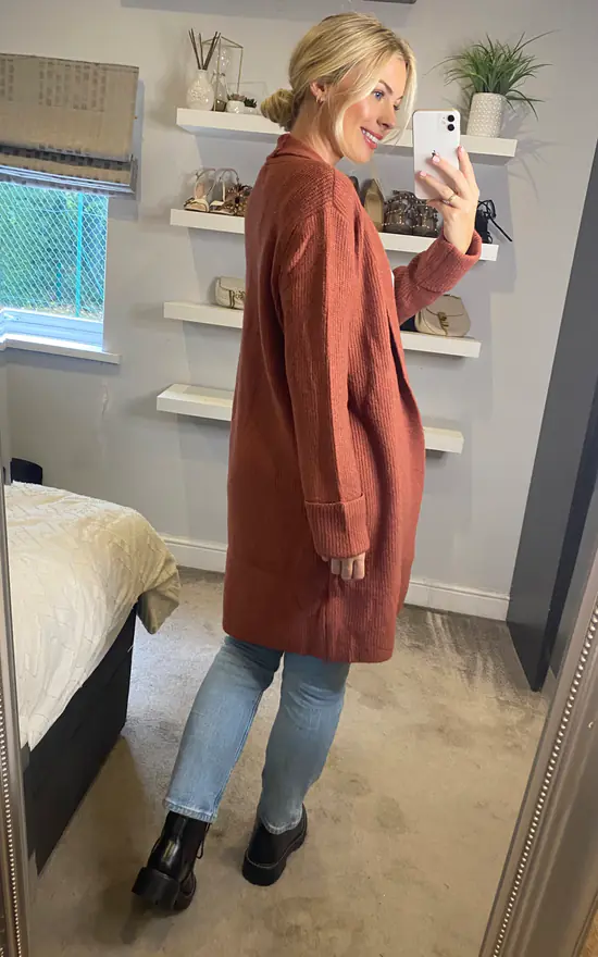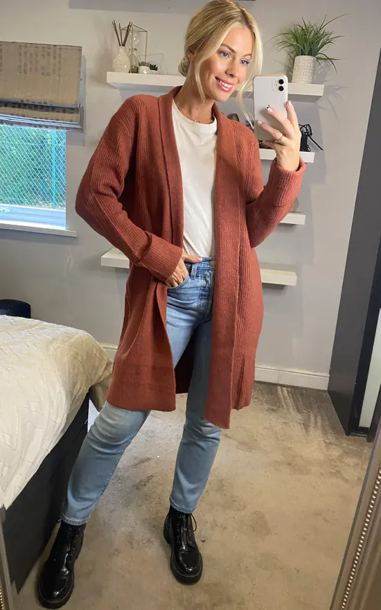 Make cosy cool in the Yumi Rust Knitted Long Cardigan. The edge to edge design will go over you winter wardrobe with ease, and is the perfect way to keep the chill off. All wrapped up in the softest knit, wear with a roll neck, denim skirt and knee high boots for an easy everyday fit. Sizing reference, S/M – 8-12, M/L – 12-6.