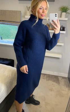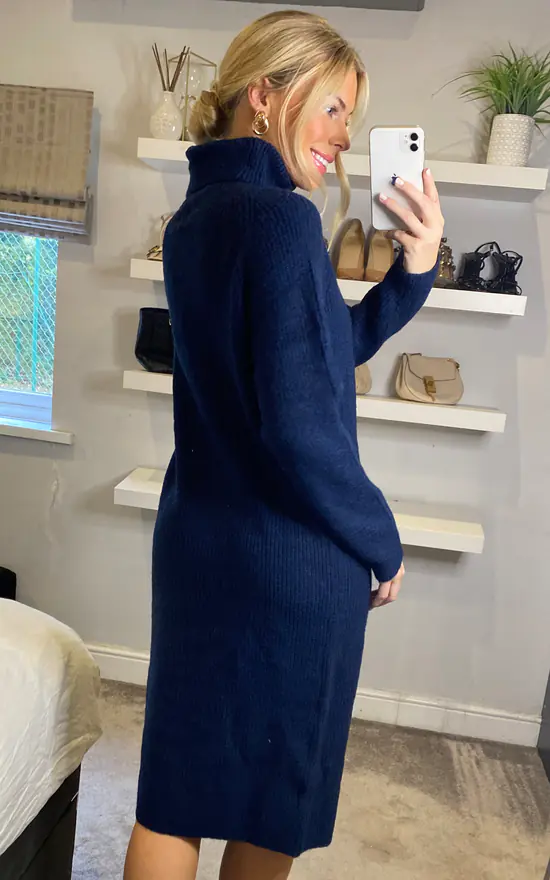 This Yumi Navy Roll Neck Knitted Midi Jumper Dress has cosy and comfortable dressing covered for the winter season. The relaxed fit, close knit and long sleeves make this an easy to wear piece that you will reach for again and again. Style with boots and a leather jacket for ultimate style and comfort.